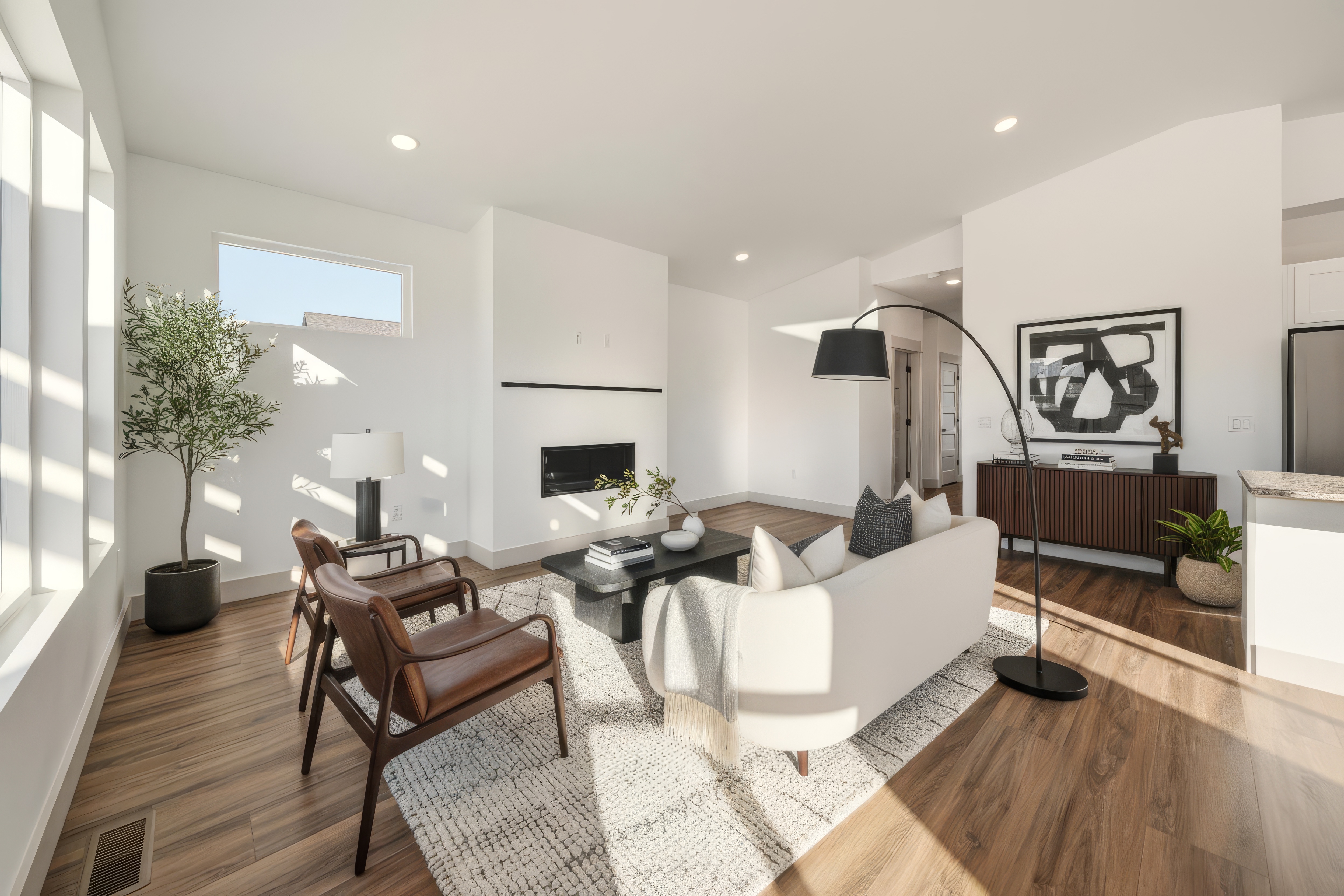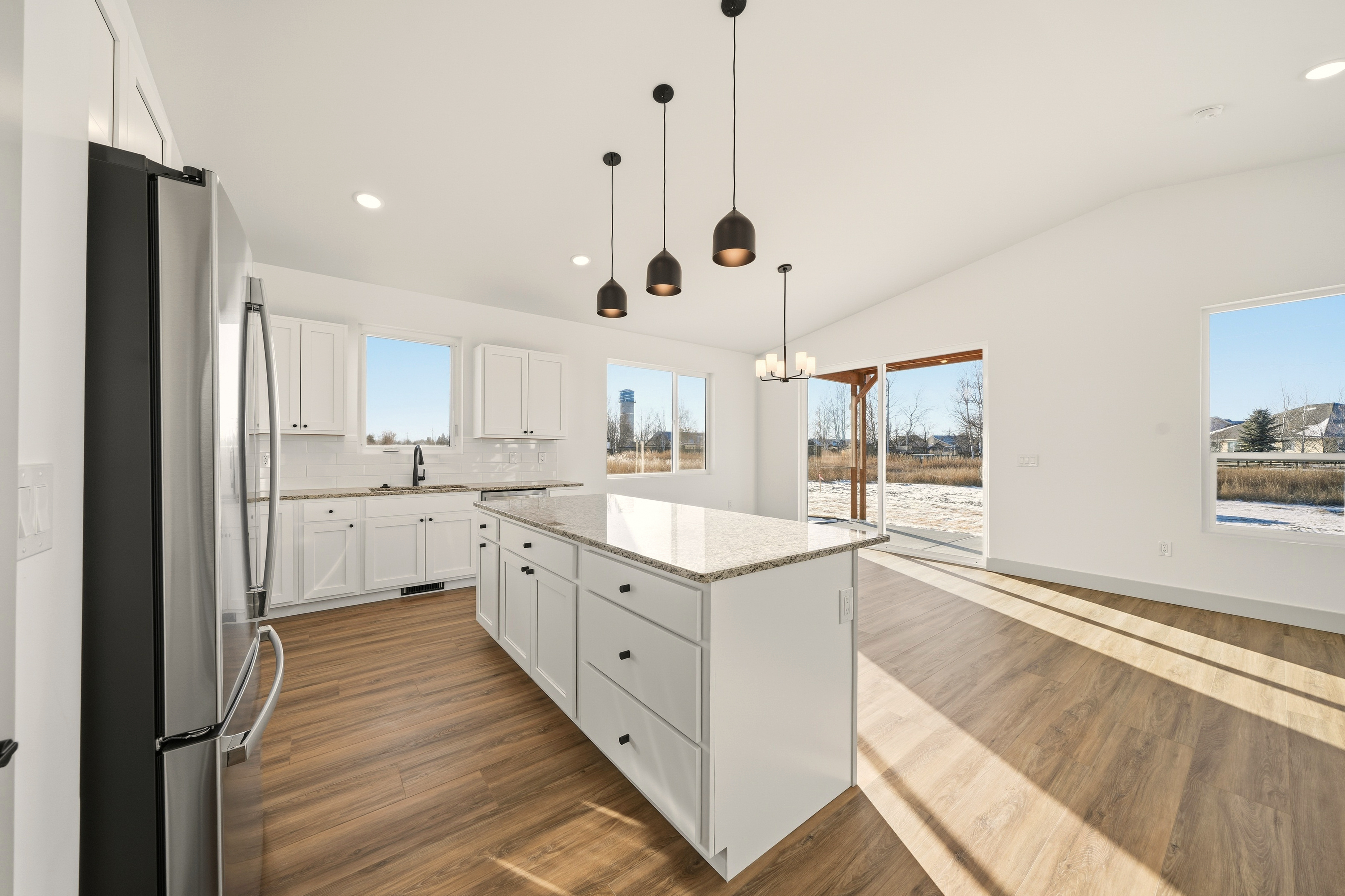 Step inside to an inviting open-concept layout featuring a chef-inspired kitchen with a large island, stylish tile backsplash, and ample cabinetry. The spacious living area is complemented by vaulted ceilings and a gas fireplace, creating a warm and elegant atmosphere ideal for entertaining or relaxing.